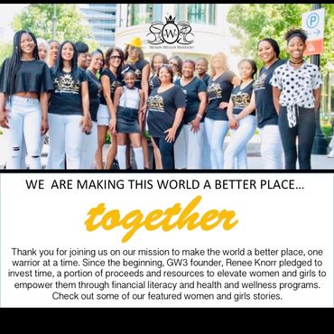 Global Women Wealth Warriors (GW3), we are dedicated to empowering families especially women and girls by providing comprehensive programs in financial literacy, health, and wellness. We focus on mentoring young women aged 12 to 22 who aspire for more in life, guiding toward a future of financial independence.
